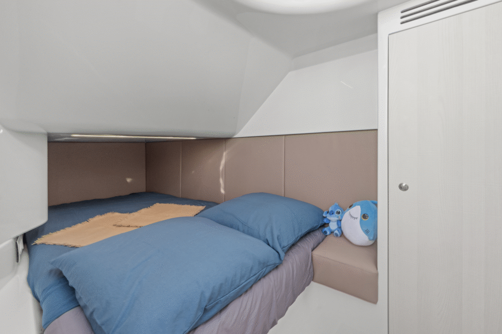 Les deux volumes sont séparés, la salle de bains étant sur bâbord et la cabine à tribord. Nul besoin de vous contorsionner pour y accéder avec leurs grandes portes papillons.