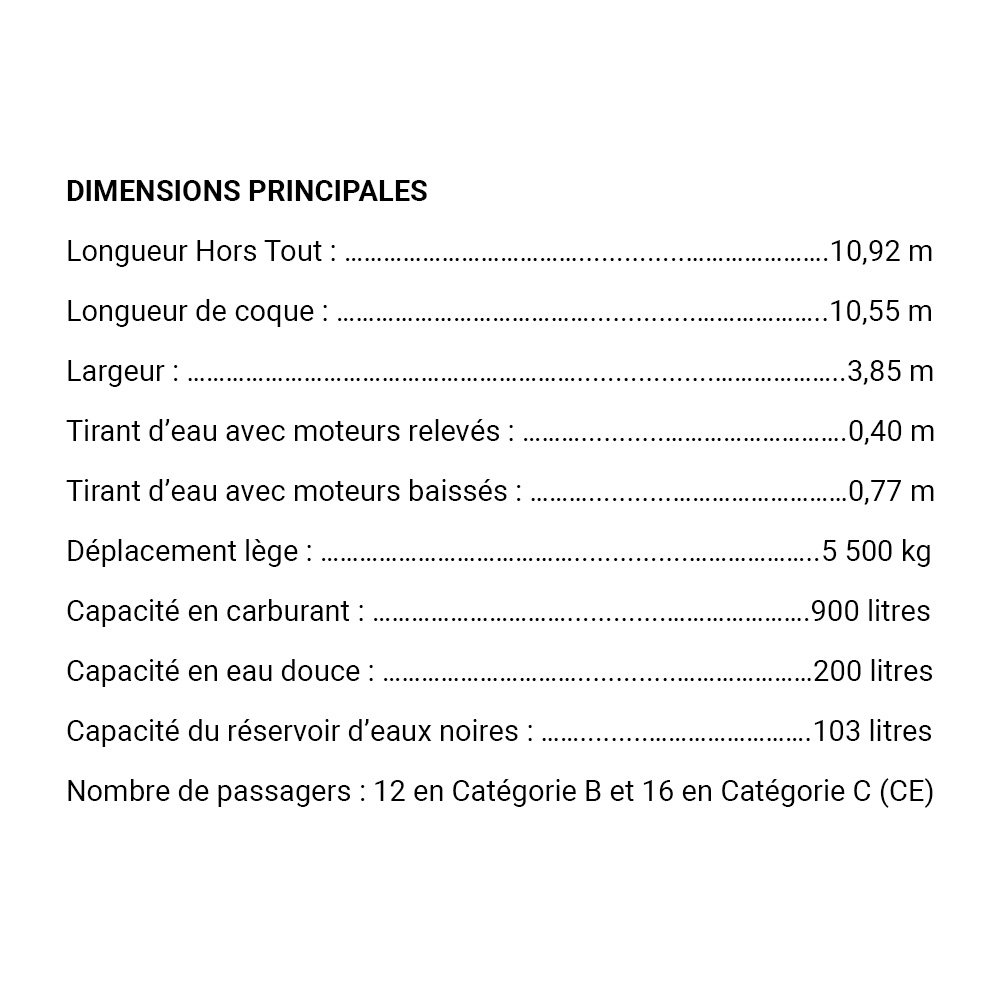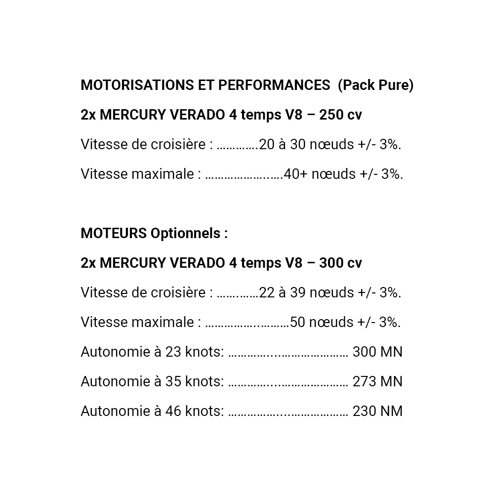 Avec ses deux Mercury 300 hp Verado, à 27 nœuds, vous ne consommerez que 82 litres à heure ce qui signifie une autonomie de 295 miles nautiques. Malgré́ tout, il est capable d’atteindre une vitesse de pointe de plus de 48 nœuds alors qu’avec les deux 300R, il est capable de plus de 53 nœuds. À bord, pas besoin de tableau électrique car chaque interrupteur est auto-protégé par un fusible thermique intégré et tout est commandé par un système Garmin® EmpirBus®.