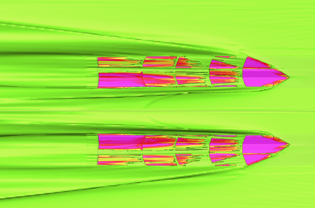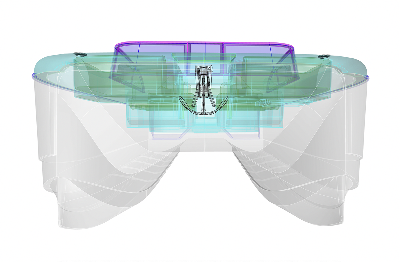 1- La coque de l’Heritage 36’ est directement extrapolée et adaptée d’un catamaran de course. Les deux coques à quadruple redans ventilés ont été longuement testées en CFD. Malgré́ son étrave verticale, il ne mouille pas grâce à des bouchains surdimensionnés. À partir d’une certaine vitesse, l’inclinaison négative du tunnel sustente partiellement le bateau.