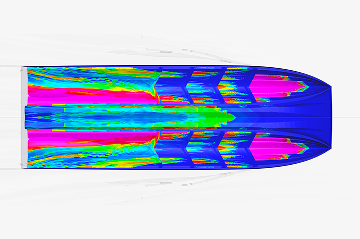 Les coques Heritage s’inspirent directement des catamarans de compétition car la course offshore est un banc d’essai impitoyable, où solidité et rendement ne tolèrent aucun compromis. L’architecture des carènes Heritage a été méticuleusement adaptée pour offrir, au quotidien, une navigation sûre, efficace et agréable. Sans rechercher la vitesse pure, la finesse de nos lignes d’eau permet des rendements jusqu’à 30% supérieurs à ceux de nos concurrents. Nos deux coques à redans ventilés ont fait l’objet de longs développements et validations en CFD(simulation numérique des flux hydrodynamiques) afin d’optimiser l’efficacité. Et malgré une étrave verticale, la navigation reste étonnamment sèche: des bouchains surdimensionnés canalisent et rejettent les embruns pour préserver le confort, même lorsque le rythme s’accélère.