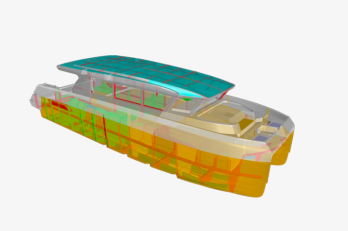 Nous avons revisité en profondeur le concept même du catamaran de plaisance à moteurs. En amont, le travail de notre bureau technique s’est construit autour de six grands commandements, véritables piliers d’une vision claire: non pas créer un modèle de plus, mais approcher l’idée du bateau idéal.